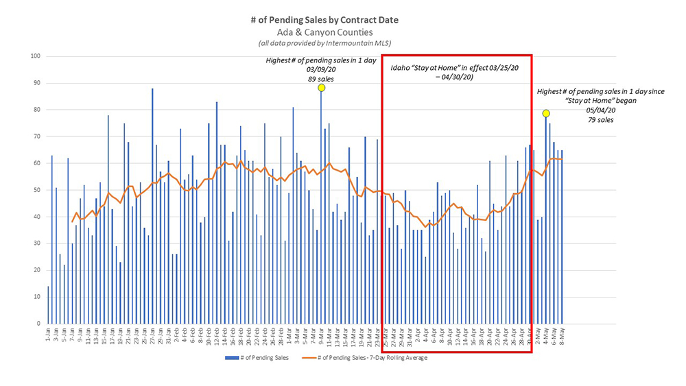According to data provided by the Intermountain MLS, 125 new listings were placed on the market on May 1st – the highest number in any one day since March 20th, before the "Stay in Place" order was issued in Idaho. Additionally, the number of accepted sale contracts jumped to 79 on May 4th, which was the highest number of new pending sales since March 9th.