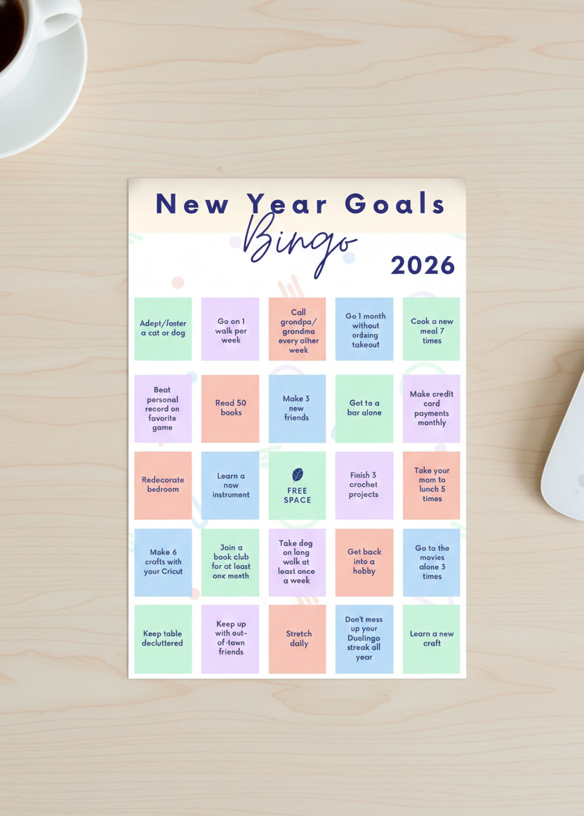 Goal bingo is exactly what it sounds like. A bingo-style card filled with meaningful, achievable goals across different areas of your life. Instead of chasing one big resolution, you focus on steady progress—checking off squares as you go and celebrating small wins along the way.